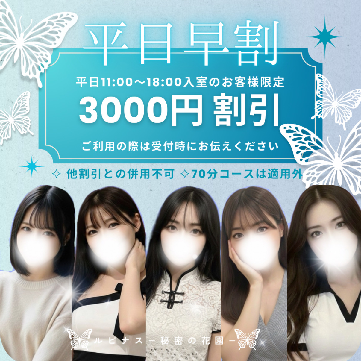 🪻🪻🪻🪻🪻🪻🪻🪻🪻🪻🪻🪻🪻\ 限定!平日早割実施中 /18:00までのご入室で 3,000円OFF!🪻🪻🪻🪻🪻🪻🪻🪻🪻🪻🪻🪻🪻日頃の感謝を込めて、平日お昼の時間をゆったり過ごしたい方に特別な割引をご用意しました🎉• 特典: コース料金から 3,000円OFF• 条件: 平日11:00〜18:00までのご入室• 対象: 70分コースは対象外※他割引と併用不可※ご利用の際は受付時にお伝えください。「夜は時間がないから、昼間にゆっくりしたい」そんな方は今がチャンスです!!この機会にぜひお得にご利用ください🦋🫧