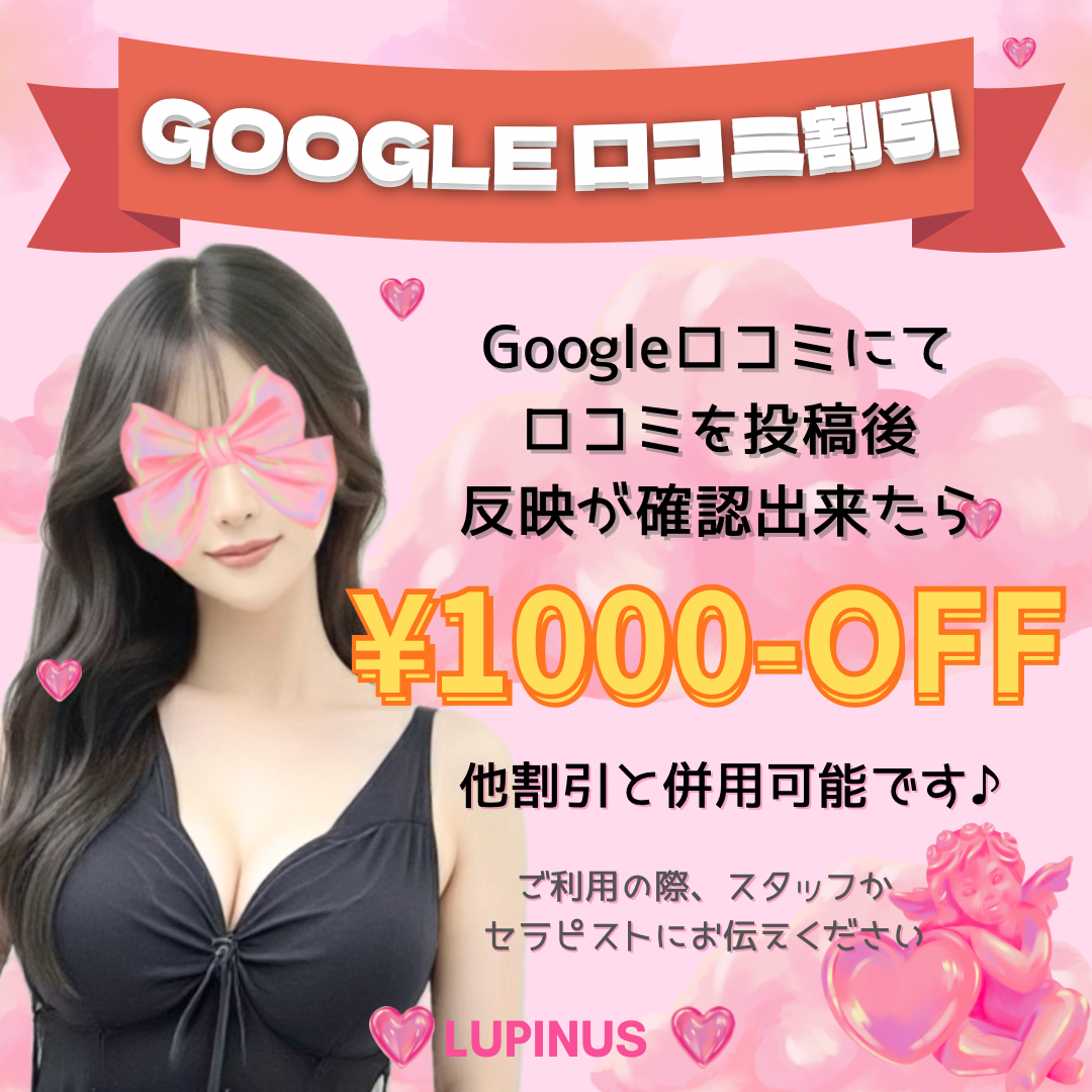 \ Google口コミで1,000円OFF / 当店では、より多くのお客様にセラピストの魅力を知っていただくため、口コミを大募集しております🦋🫧 Googleで温かいメッセージを投稿してくださったお客様には、感謝の気持ちを込めて【1,000円割引】を適用させていただきます。 🌈 ━━━━━━━ 割引適用の流れ ━━━━━━━ 🌈 ① 口コミを投稿 当店のGoogleページから、率直なご感想をお聞かせください。 ② アカウント名を提示 受付スタッフまたはセラピストへ、「投稿したアカウント名」をお伝えください。 ③ その場で1,000円割引 投稿内容の確認ができ次第、コース料金から割引させていただきます✨ 💡 他割引との併用もOK! ※ 星のみは割引不可になります。   他割引と組み合わせて、さらにお得にご利用いただけます♪ 皆様からの素敵なメッセージを、セラピスト一同心よりお待ちしております🦋✨